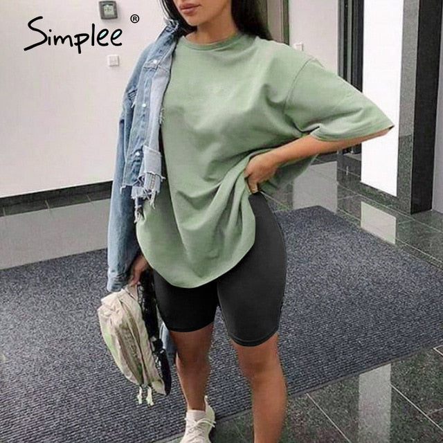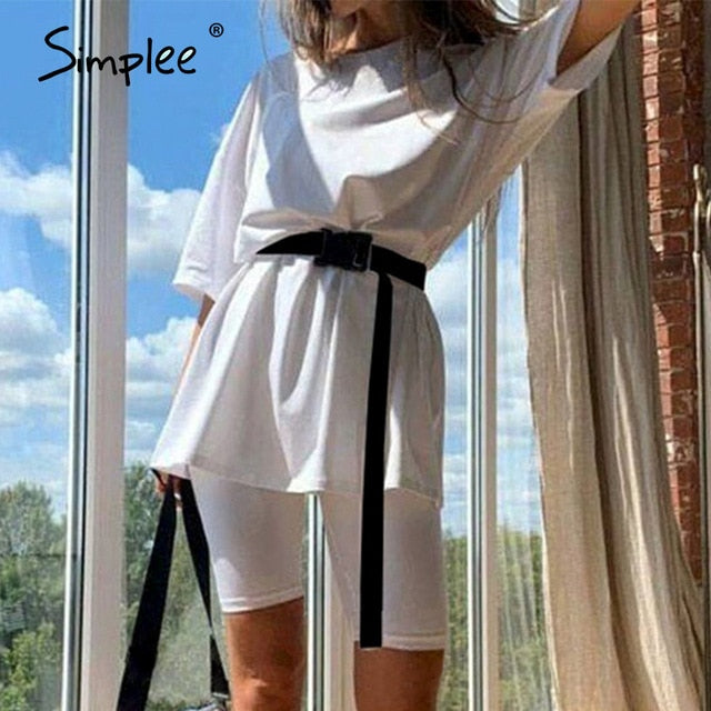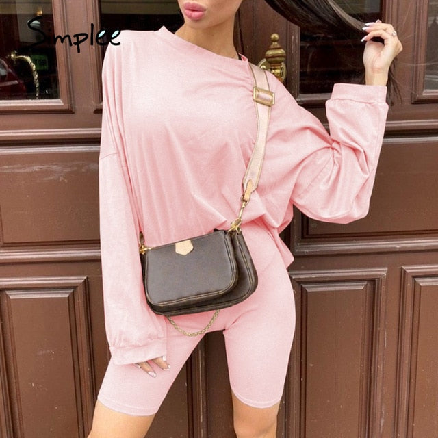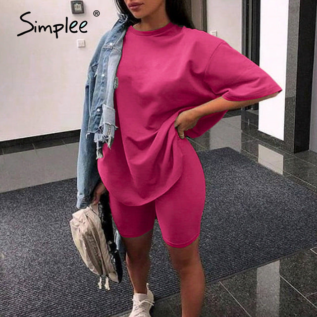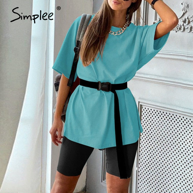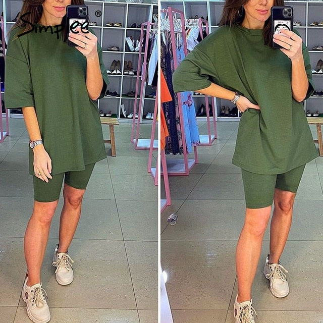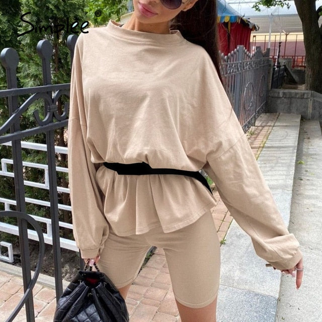 Simplee Casual solid outfits women's two piece suit with belt Home loose sports tracksuits fashion leisure bicycle suit summer